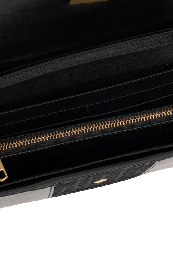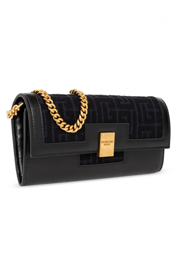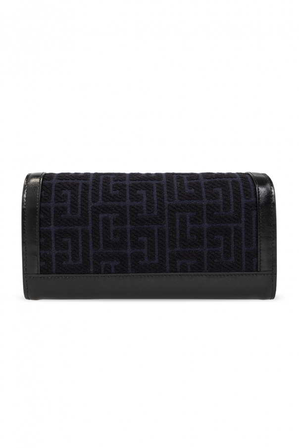 Black and navy blue ‘1945’ wallet from Balmain. Crafted from calf leather and monogrammed jacquard material, this design secures with a snap closure with a logo-engraved rectangular application and showcases a detachable shoulder strap reinforced with a chain, antiqued gold-tone metal hardware and one internal compartment with one zip pocket, two slip pockets and ten card slots.