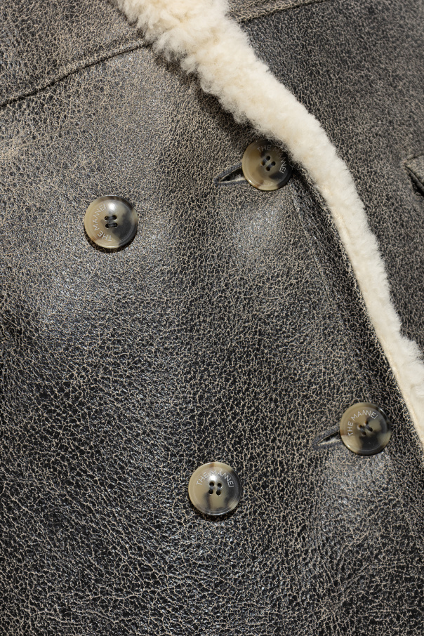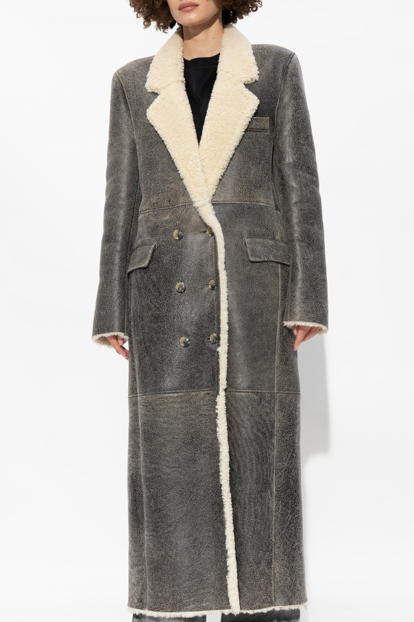 Long, dark grey ‘Greenock’ shearling coat from The Mannei. Made of textured leather with beige fur trims, this garment features buttons, notch lapels, two flap pockets, one slip pocket, buttoned pocket at the back, single rear vent and long sleeves with decorative buttons.