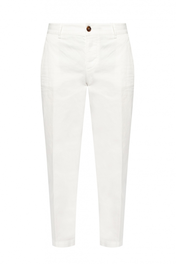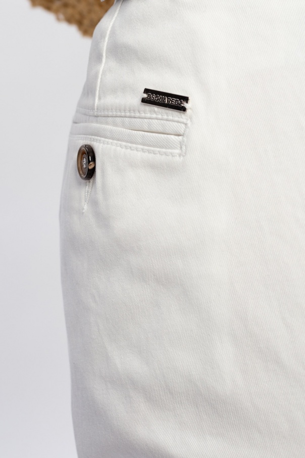 White ‘Hockney Fit’ jeans from Dsquared2. Crafted from stretchy cotton denim with legs that taper towards the ankles, this pair features a button fastening, two slip pockets, two buttoned pockets and a silver-tone plaque on the back.