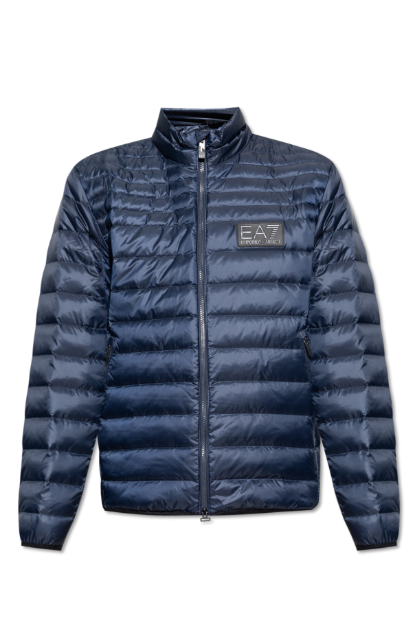 Navy blue down jacket with a standing collar from EA7 Emporio Armani. Emblazoned with a black rubber logo patch, this style features a two-way zip fastening, two zip pockets, long sleeves and piping on the bottom hem and cuffs.