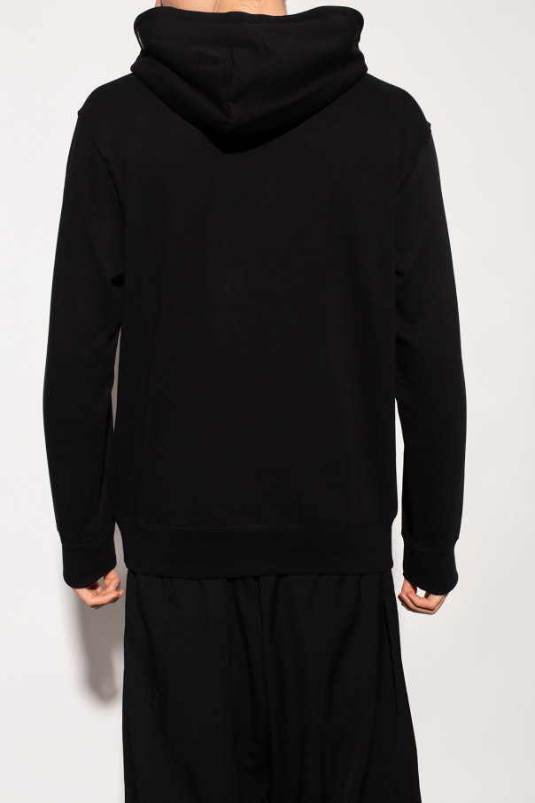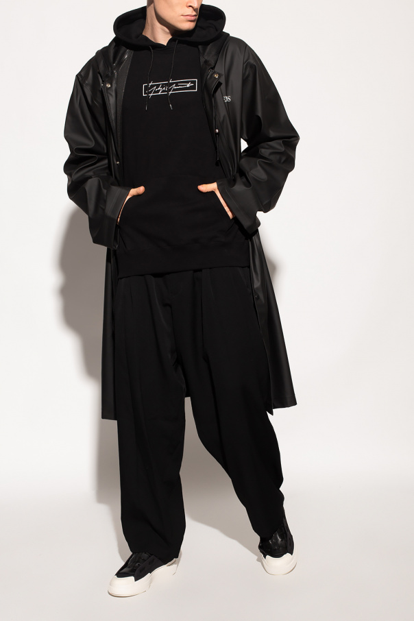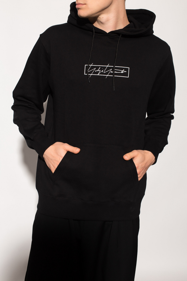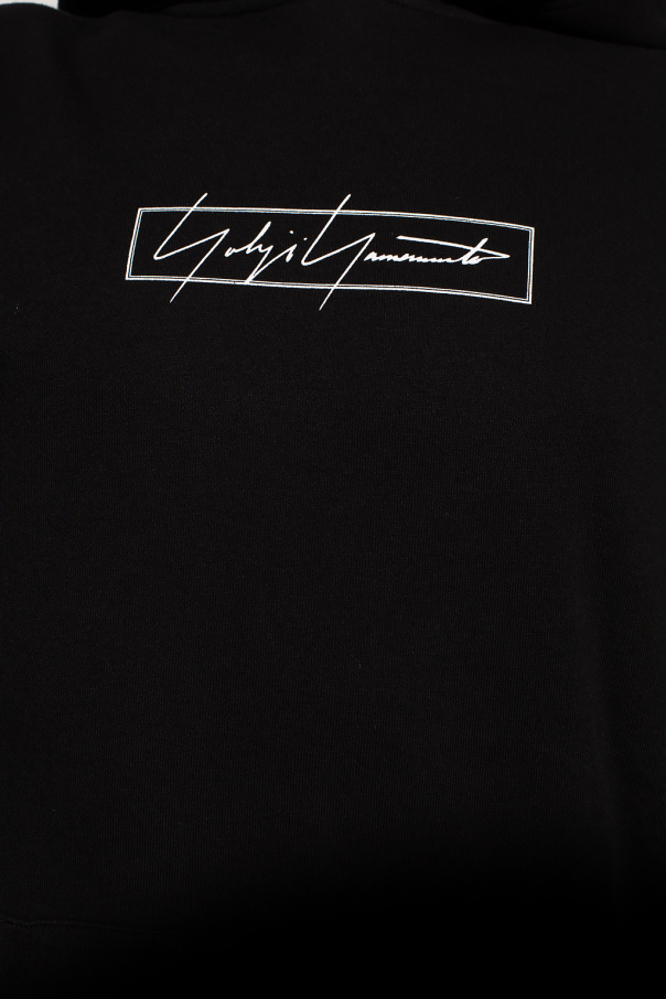 Black hooded sweatshirt from Yohji Yamamoto x New Era. Crafted from cotton jersey, this hoodie showcases a white graphic print with the brand\'s logo on the front, a kangaroo pocket, an elasticated bottom hem and cuffs and a drawstring hood embroidered with a white logo.