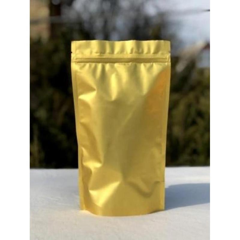 ПЭТ пакет дой-пак золотистого цвета для герметичной упаковки сухих товаров и жидкостей. Подходят для упаковки россыпью. Размеры пакета – 180 х 280 миллиметров. Имеет струнный замок Zip-Lock, а также внутренний запаечный клапан. Рассчитан на индивидуальную и групповую упаковку различных продуктов питания и непищевых товаров общим весом до 1 килограмма и объемом до 500 миллилитров. Зачастую используется для упаковки и фасовки различных жидкостей объемом 300-350 миллилитров, листового чая весом до 100 граммов, кофе в зернах общим весом до 150 граммов, кристаллической соли и сахара общим весом до 500 граммов.