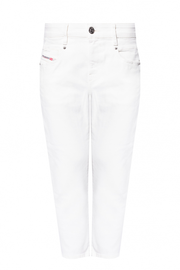 White ‘D-Fayza’ jeans from Diesel. Made of cotton with distressed effects, this pair falls down with tapered legs and features a zip fly with a button, classic five pockets, raw-trimmed edges and a logo-embossed patch at the back.