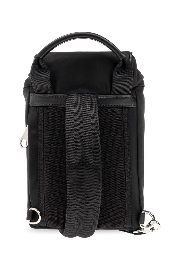 Black ‘Murray’ one-shoulder backpack from Burberry. Crafted in part from material ECONYL®, this design cinches closed with drawstrings and showcases a rubber logo patch and lace-up detailing on the front, calf leather trims, back zip vent, half-round handle, adjustable strap, silver-tone metal hardware and one internal compartment with a slip pocket.
