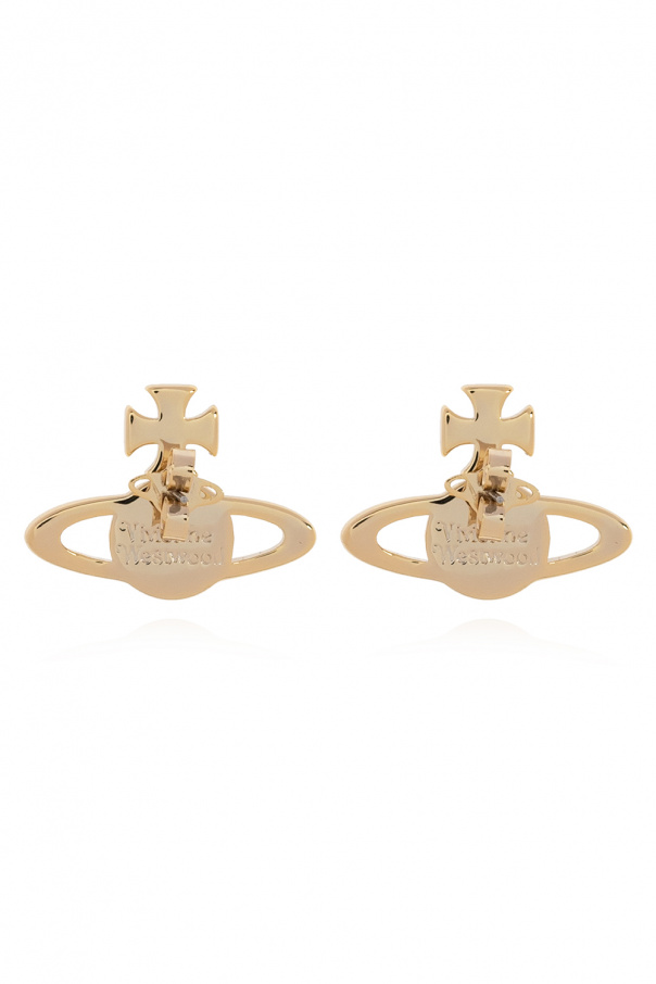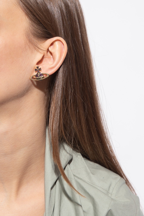 Dark purple and gold-tone ‘Mayfair’ earrings from Vivienne Westwood. Made of brass, they secure with a stud fastener and showcase a logo application adorned with dark purple crystals and gold-tone rivets.