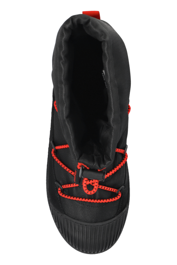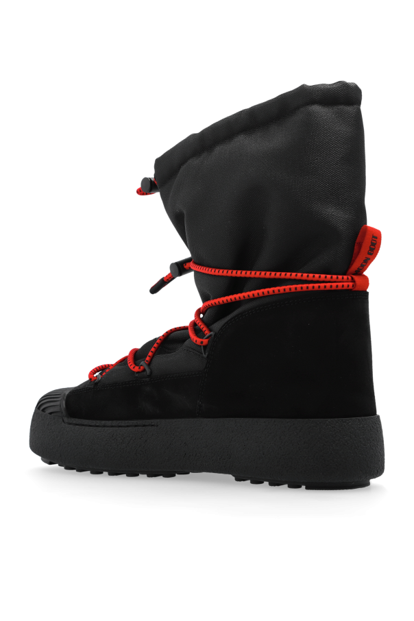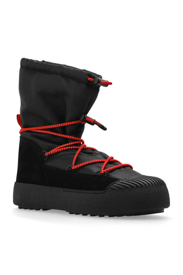 Introducing the MB Mtrack Polar Cordy—a sublime embodiment of elegance and utility, crafted for the discerning gentleman. These men\'s snow boots, from the exclusive Moon Boot collection, are a testament to sophisticated design and pragmatic craftsmanship. The boots boast a dominant black hue, accentuated by striking red elements. The high ankle silhouette is not only aesthetically pleasing but offers superior protection against the elements. Glistening with a smooth surface and distinct stitching, the exterior is fashioned from moisture-resistant technical material, ensuring durability. Complemented by plush inner lining for thermal comfort, these boots feature vibrant red laces and a practical red pull tab at the rear for effortless wear. The robust rubber sole with a pronounced tread guarantees exceptional grip on icy terrains. Why Choose This Product? Crafted with high-quality leather exterior and comfortable material interior. Designed with a high ankle cut for enhanced protection and style. Equipped with a non-slip rubber sole for superior traction. Adorned with unique red accents for a standout look. Perfect blend of fashion and function for winter conditions.