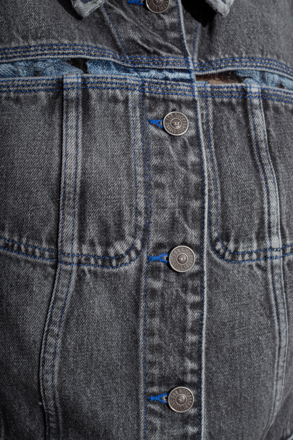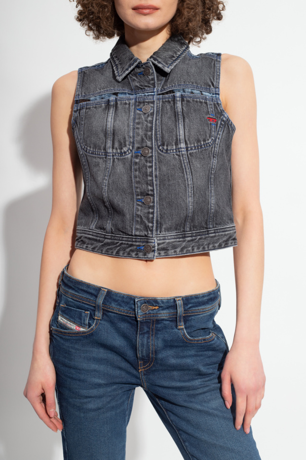 Dark grey ‘DE-SLIMMY-SM-FSB’ denim vest from Diesel. Made of a cotton and hemp blend, this pair features button fastenings, maroon logo embroidery and navy stitching details.