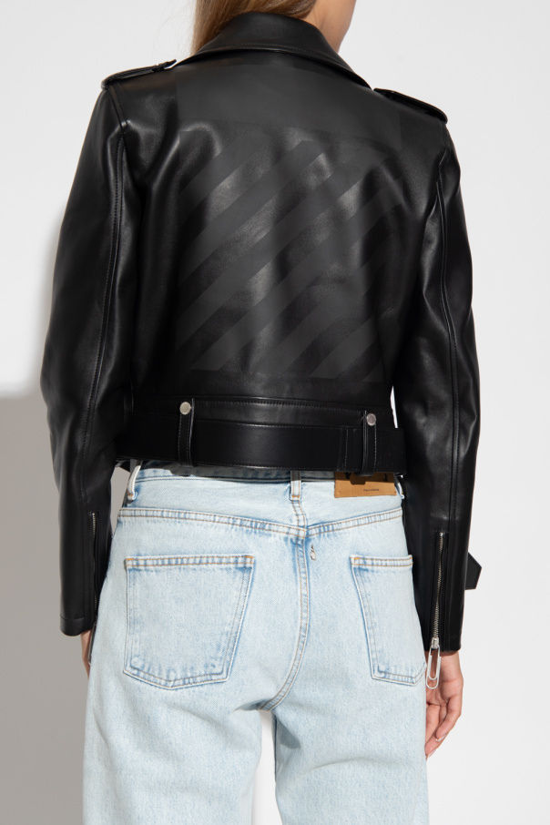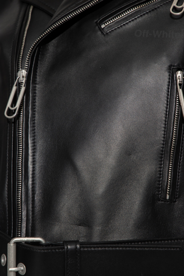 Black biker jacket from Off-White. Made of leather, this garment is complete with a two-way zip, buckle strap, logo detail, the label’s signature diagonal stripes in dark grey, three front zip pockets with the label’s signature metal paper clips and hardware in silver-tone.