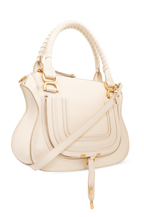 Cream ‘Marcie Medium’ shoulder bag from Chloe. Made from grained calf leather, this design fastens via a zip and showcases an embossed logo, exposed stitching details, two half-round handles, one frontal pocket with a fringed slide fastener, gold-tone metal elements as well as an adjustable shoulder strap and one internal compartment with a zip pocket.