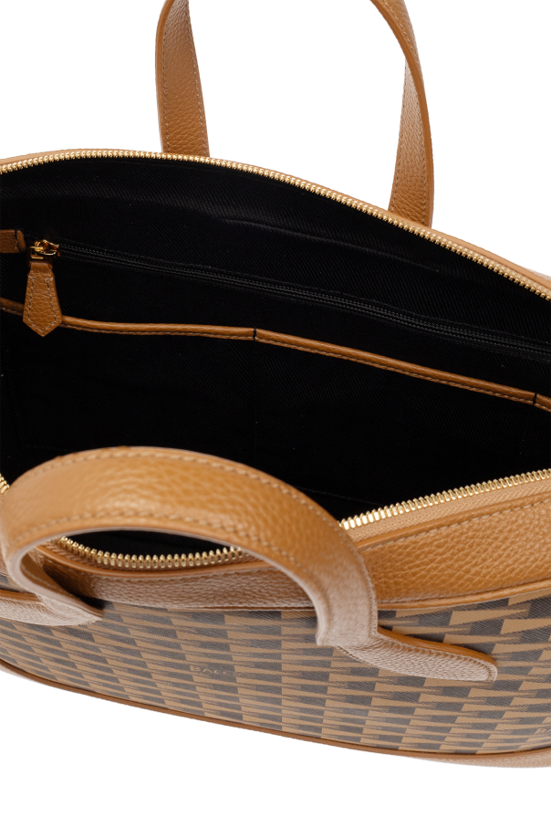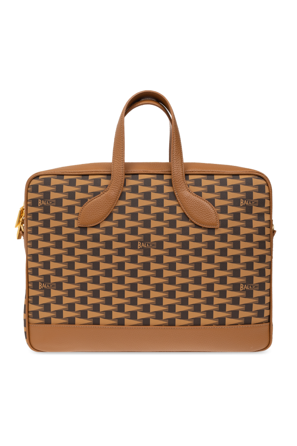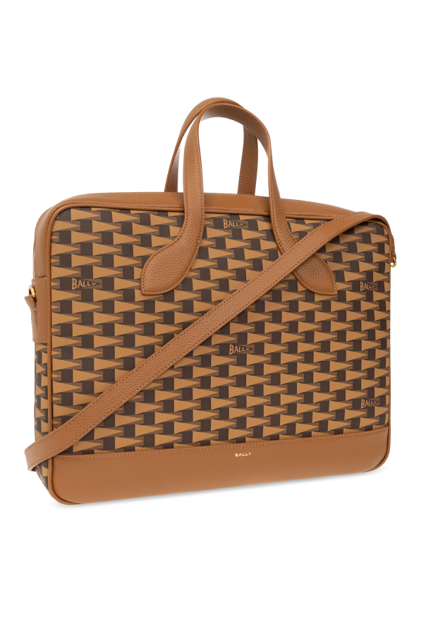 Brown briefcase from Bally. Made of coated canvas and leather, this design fastens with a two-way zip and showcases a logo pattern, two half-round handles accompanied by an adjustable shoulder strap, gold-tone metal hardware and one internal compartment with two zip pockets and two slip pockets.