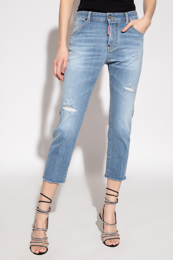 Blue ‘Cool Girl Cropped’ jeans from Dsquared2. Made of cotton, this pair falls with tapered legs and features button fastenings, classic five pockets, frayed hems and a cream, grey and red logo patch at the back.