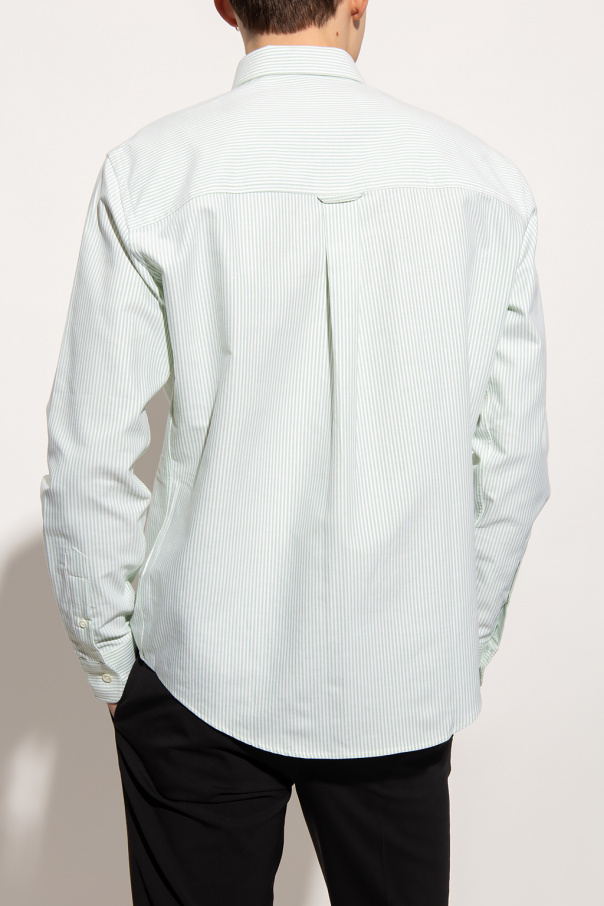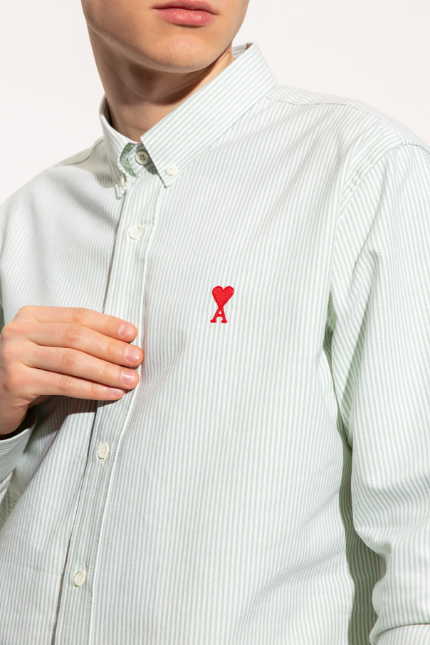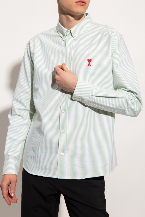 White and light green shirt from Ami Alexandre Mattiussi. Made of organic cotton, this garment features button fastenings, stripe pattern, red ‘Ami de Coeur’ embroidery and long sleeves with button cuffs.