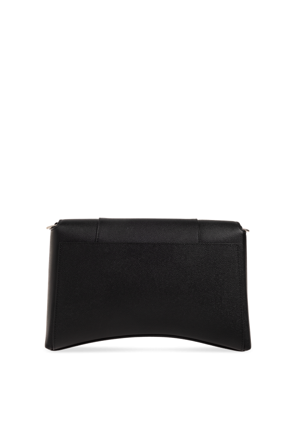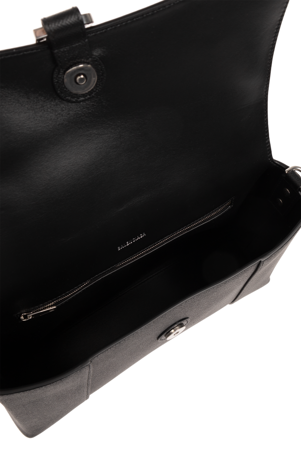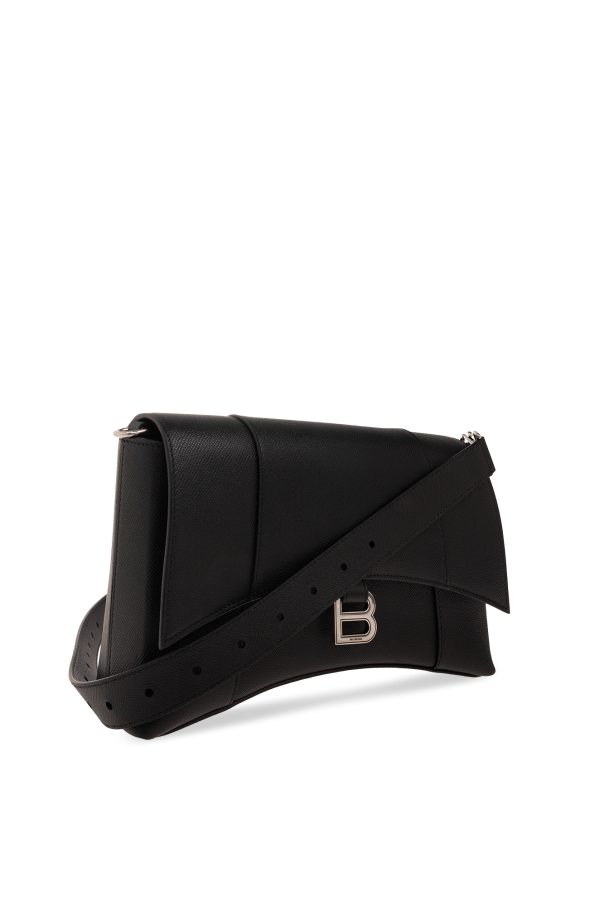 Black ‘Downtown’ shoulder bag from Balenciaga. Made of grained calf leather, this design features a snap closure, flap with a metal logo-engraved B detail, back pocket, detachable and adjustable shoulder strap, silver-tone metal hardware and one internal compartment with two slip pockets and one zip pocket.