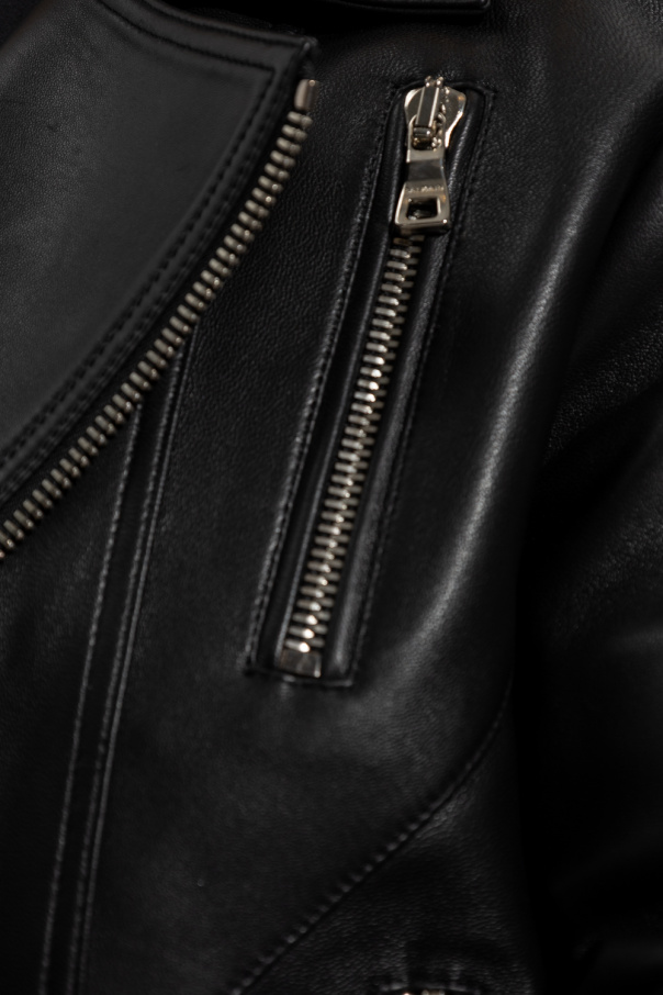 Black biker jacket with a collar from Balmain. Made of lamb leather, this garment features a silver-tone metal zip, four zip pockets, decorative stitching details, long sleeves with zips and lining printed with a white logo.