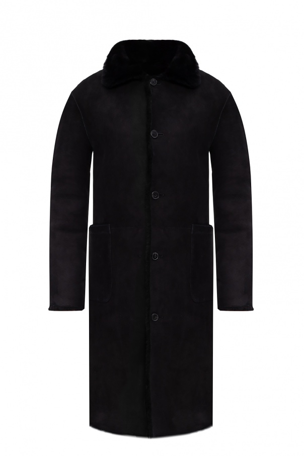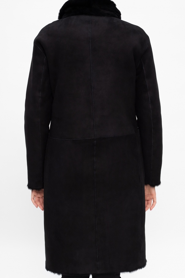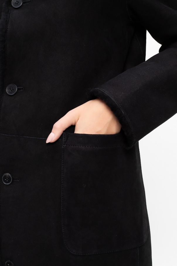 Black \'Serra\' jacket from AllSaints. Crafted from sheepskin and shearling, this design fastens via buttons and employs a classic wide-spread collar and two side pockets.