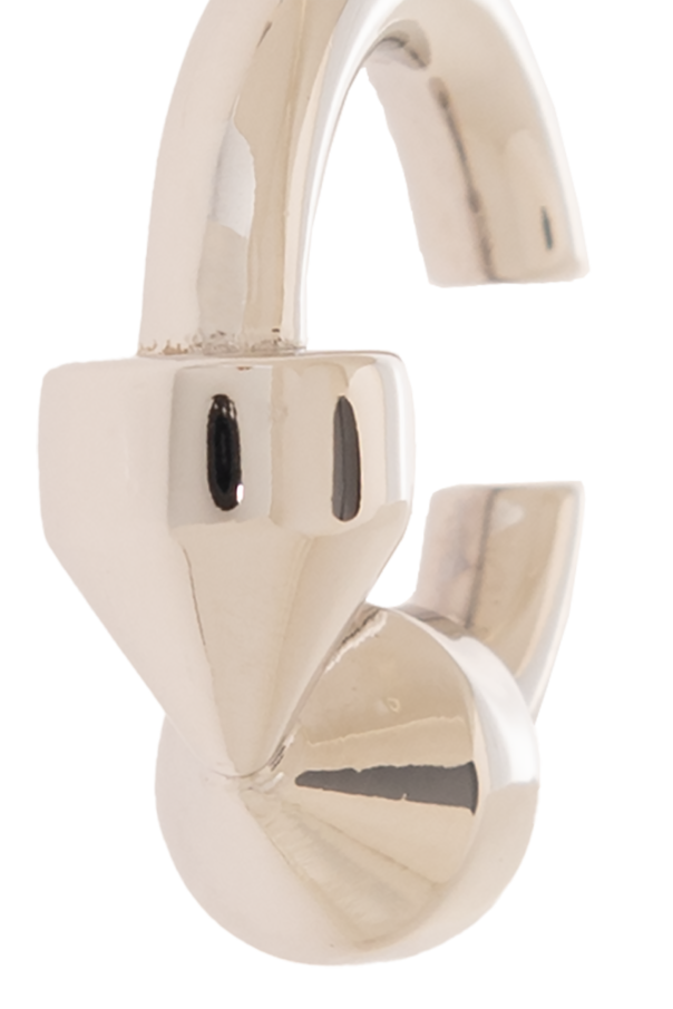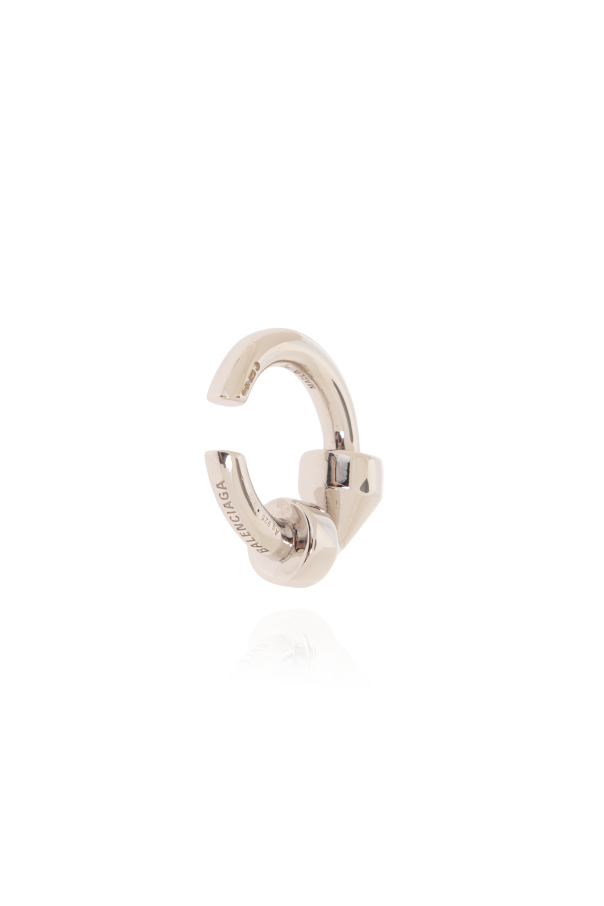 Introducing the Silver Ear Cuff by Balenciaga, a masterpiece of modern jewelry design that exudes sophistication and avant-garde aesthetics. Crafted from 100% silver, this ear cuff boasts a mirror-like sheen that captures the light and the attention of any room. Its unique, geometric composition forms an abstract arrangement that seamlessly blends with the natural contours of the ear. The ear cuff is composed of three interconnected parts: the upper segment mimics the ear\'s shape, the middle, the widest part, slightly resembles the letter \"U\", and the bottom segment forms a delicate crescent shape. This exquisite piece is designed to adorn the ear with elegance, creating a bold statement without the need for piercings. Upon closer inspection, the ear cuff reveals a smoothly polished surface, impeccable craftsmanship, and the subtle engraving of Balenciaga\'s logo, affirming its exclusive nature and designer pedigree. Its minimalist style, devoid of overt branding, enhances its luxurious appeal, making it a distinguished accessory for those who appreciate the finer details in fashion. Why Purchase This Product? Made from premium 100% silver for lasting beauty and luster. Exceptional craftsmanship and attention to detail, including a discreetly engraved logo. Features a unique, contemporary design that complements any sophisticated attire. Easy to wear and adjust, suitable for any ear shape without the need for piercings. An exquisite piece from the renowned designer house of Balenciaga, known for their innovative and luxurious fashion.
