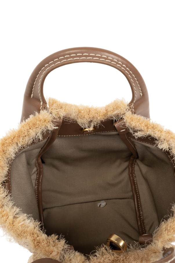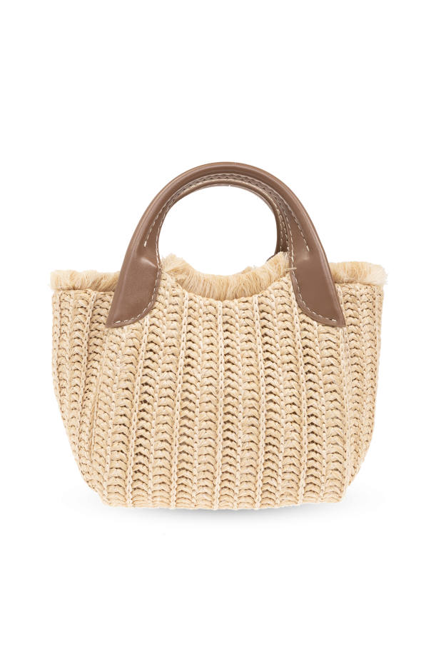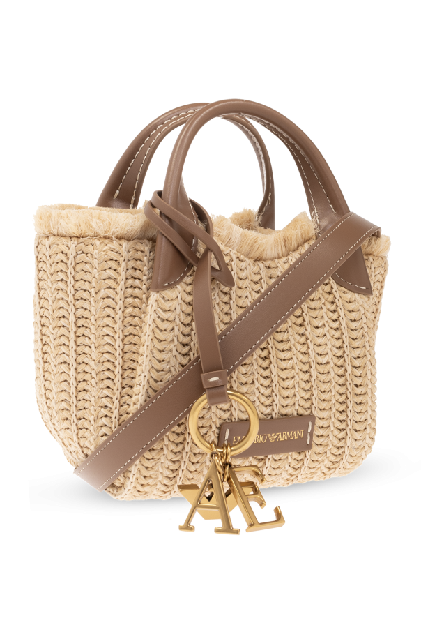 Beige shoulder bag from Emporio Armani. Woven from raw-trimmed jute, this model features faux leather trims, a carabiner clip closure, gold-tone logo patch, detachable strap with logo charms, two half-round handles, detachable and adjustable shoulder strap, one internal compartment and gold-tone metal hardware.