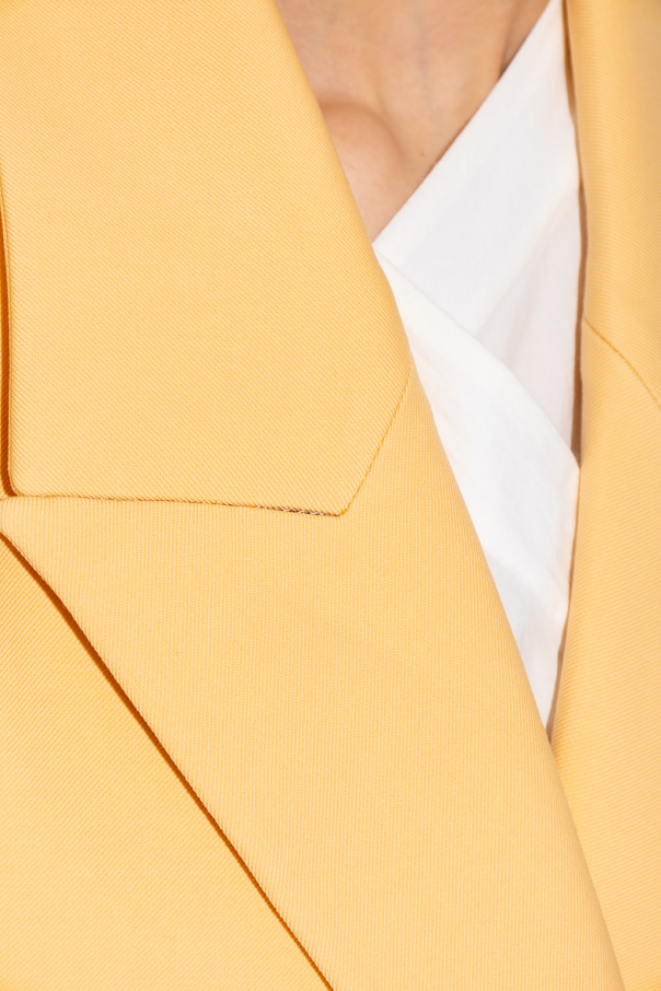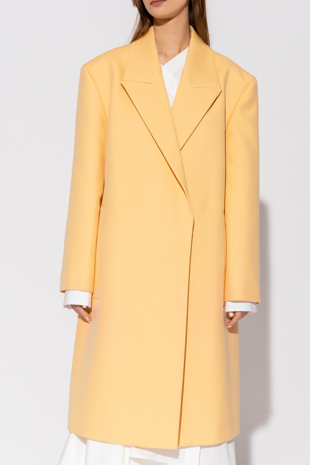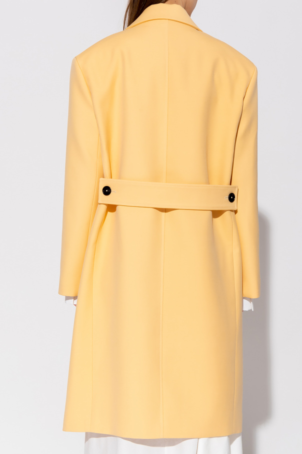 Orange double-breasted coat from Jil Sander. Made of wool, this style features peak lapels, button fastenings, long sleeves, two front slip pockets and a detachable belt at the back.