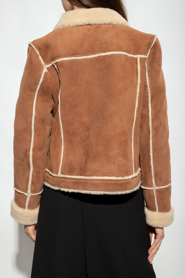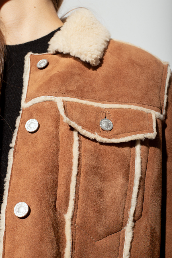 Brown ‘Kingsly’ jacket from AllSaints. Made of sheepskin with a denim trucker shape, this style features button fastenings, two flapped pockets with buttons and exposed shearling seams on the collar and cuffs.