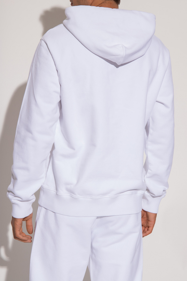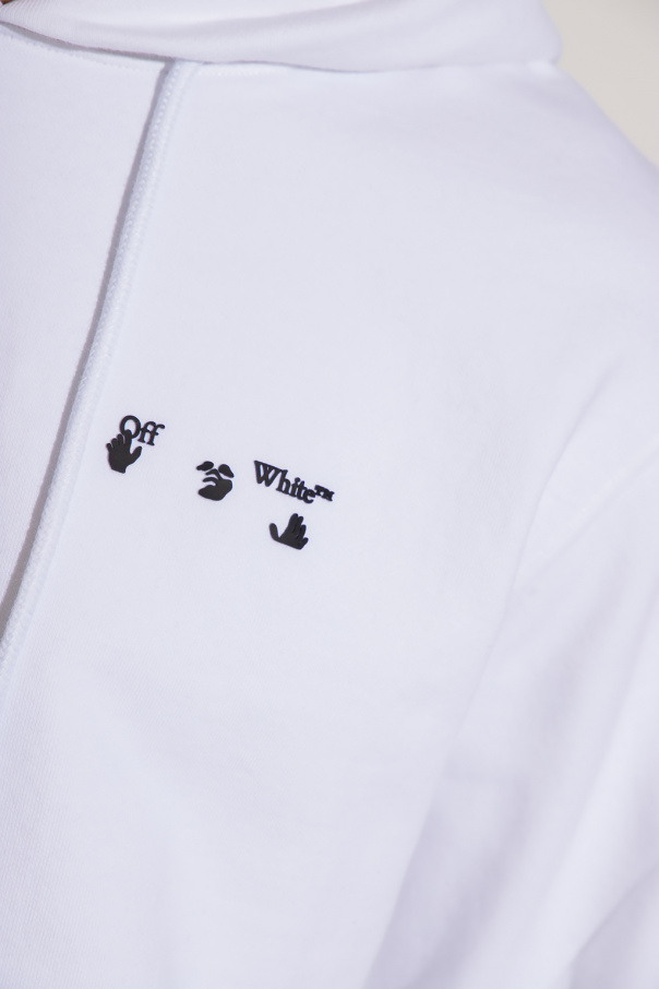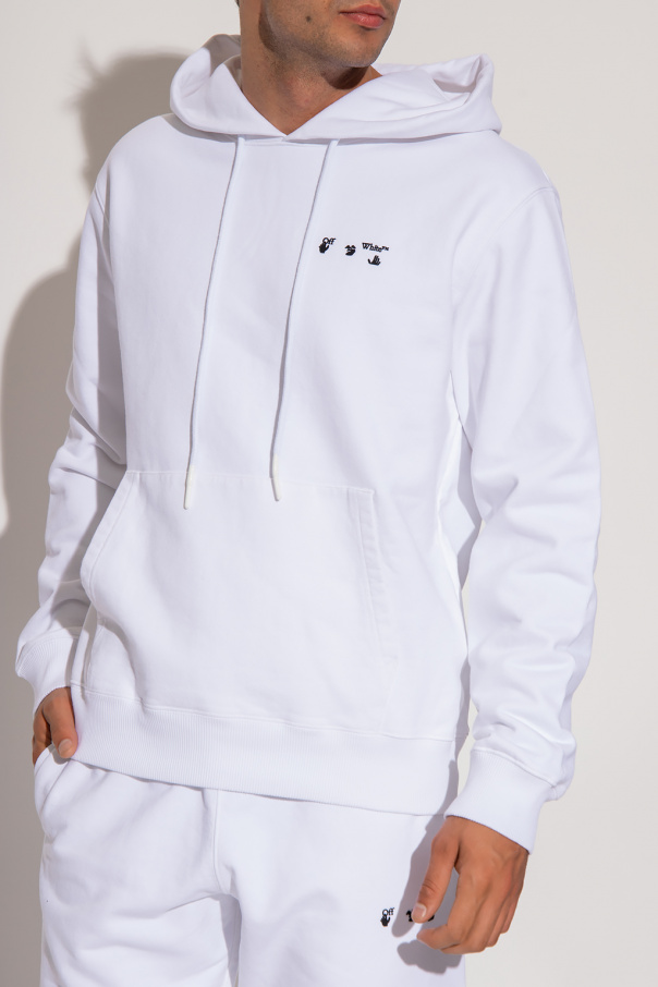 White hoodie from Off-White. Crafted from cotton, this garment features a black logo appliqué, drawstring hood and ribbed trims at the hem and cuffs.