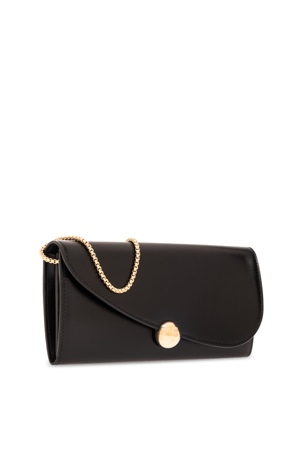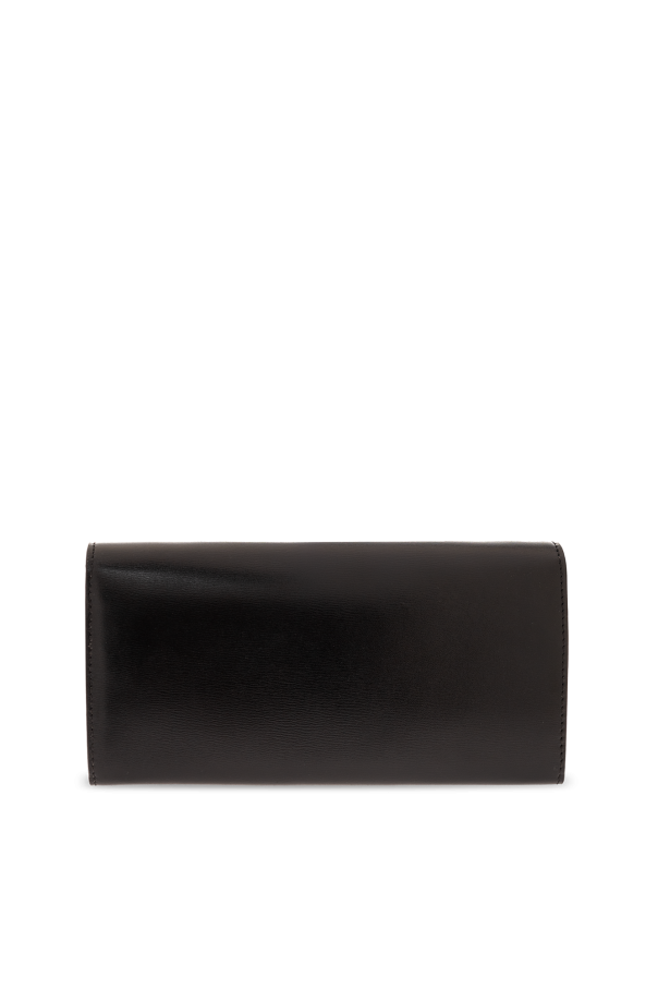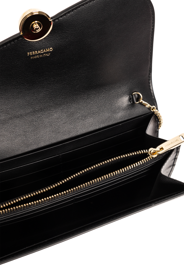 Black wallet from FERRAGAMO. Made of leather, this item features an engraved logo, gold-tone metal hardware, detachable shoulder chain and two internal compartments with ten card slots, two slip pockets and one zip pocket.