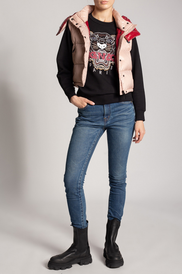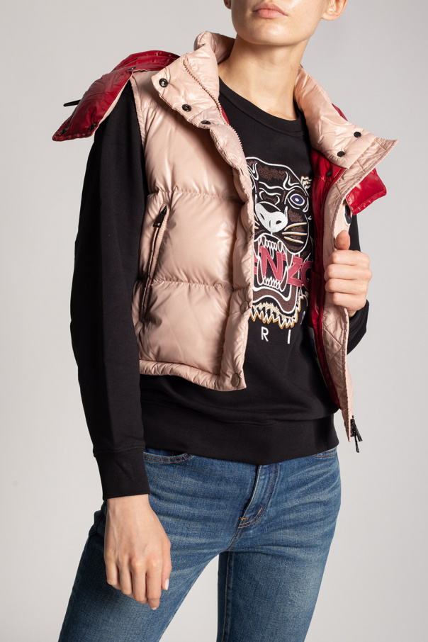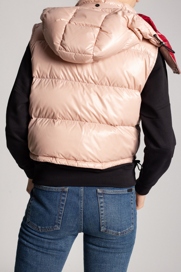 Blush pink down vest with a detachable hood from Moncler. Fastened with a two-way zip and snaps, this garment features two zip pockets, a stand-up collar, drawstring hem and cream patch embroidered with a navy and red logo.