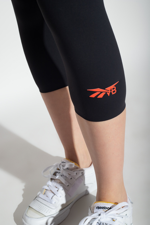 Black leggings with a printed logo pattern in black from Reebok x Victoria Beckham.