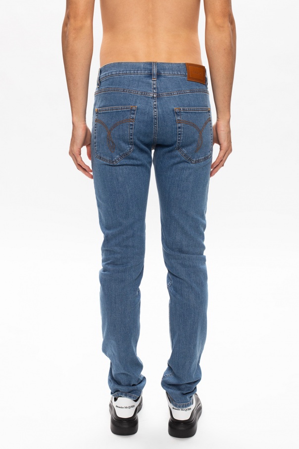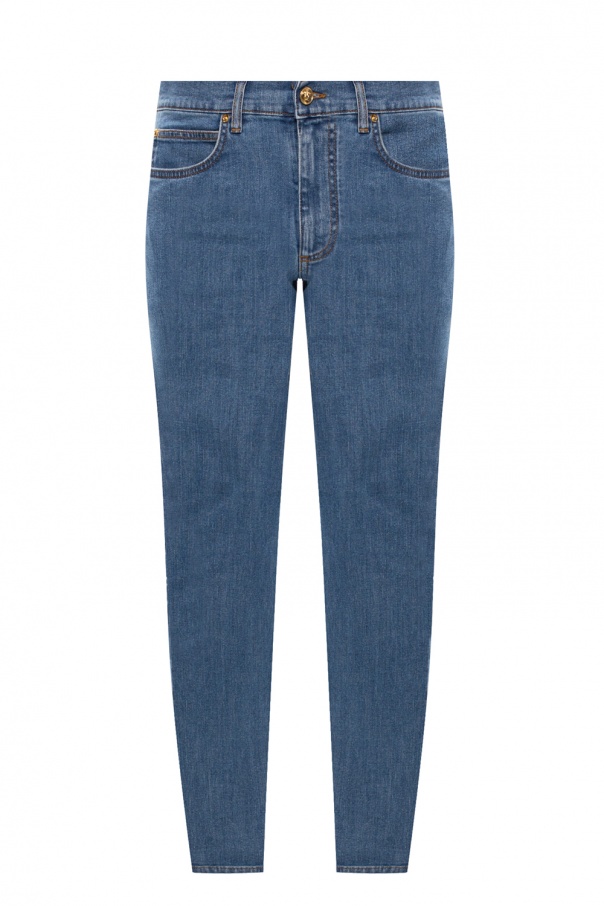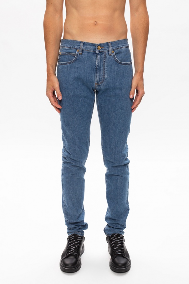 Blue jeans from Versace. This straight leg, four pocket design fastens with a zip and a button embellished with an embossed Greca motif and a Medusa head detail.