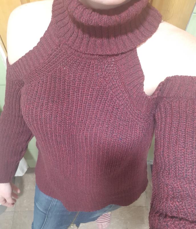 Модный хлопковый свитерок с открытыми плечами. Вещь реально клевая!!!! На фото одет на S. Реальный цвет бордо с меланжем как на фото1 и 3