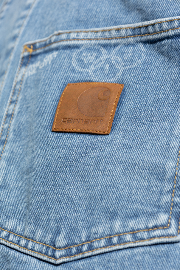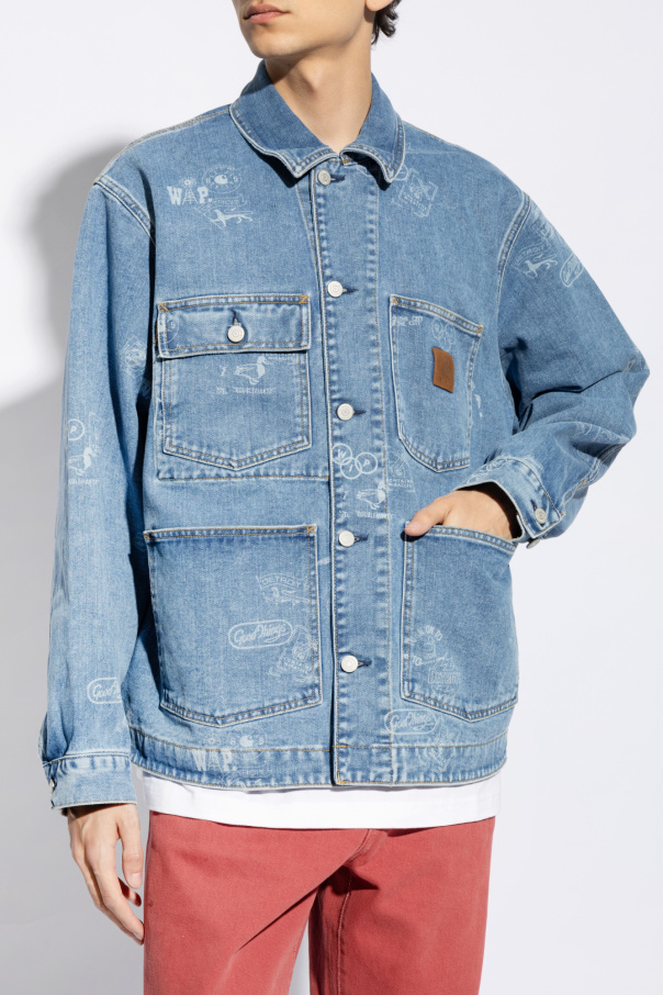 Introducing the epitome of urban sophistication: the Carhartt WIP Tapered Denim Jacket. This exclusive piece, crafted from premium denim, marries classic style with contemporary edge. Its distinctive blue hue is adorned with subtle, graffiti-inspired patterns, lending an artistic flair that sets it apart. The jacket\'s design is meticulously thought out, featuring a button closure, a classic collar, and long sleeves with buttoned cuffs for a timeless appeal. The front boasts two chest pockets with snap closures and two side pockets, combining functionality with fashion. The tapered fit not only enhances its modern silhouette but also ensures a flattering fit for any body type. Unique to this piece is a leather patch bearing the Carhartt WIP logo, signifying its authenticity and elite status within the designer clothing realm. Made entirely of cotton, this jacket promises durability without compromising on comfort, perfect for transitioning between seasons. Why Purchase This Product? Exclusive Design: Stand out with a unique, graffiti-like pattern. High-Quality Material: Crafted from 100% cotton denim for lasting wear. Functionality Meets Style: Equipped with four pockets and a sleek, tapered fit. Designer Authenticity: Adorned with a Carhartt WIP logo patch, affirming its premium status.