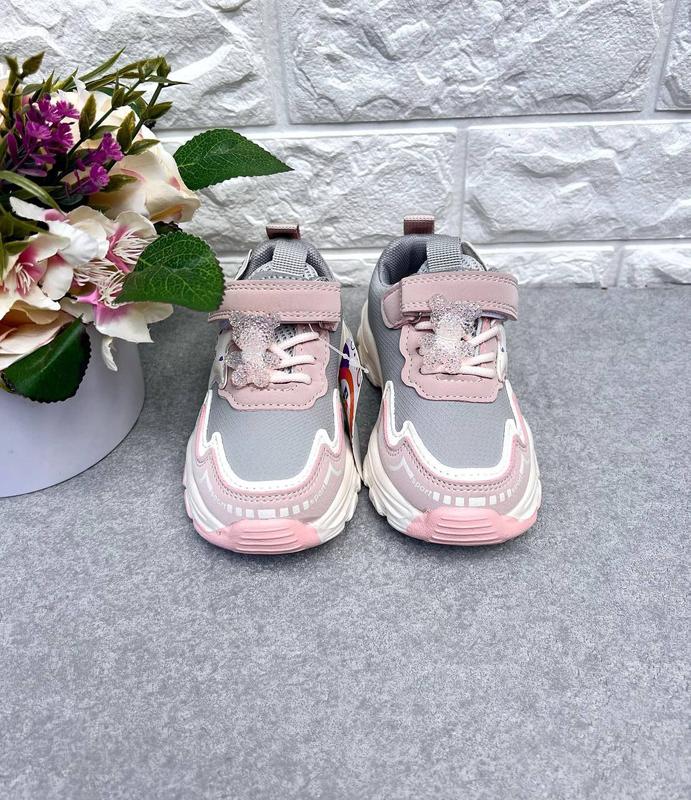 👧Чудова новинка від JG 🤩 сіро-рожеві, верх еко-шкіра, піночна підошва, дуже легенькі, устілка шкіряна з супінатором, регулюються шнурками-резинками та ліпучкою, прикраса ведмедик знімається.