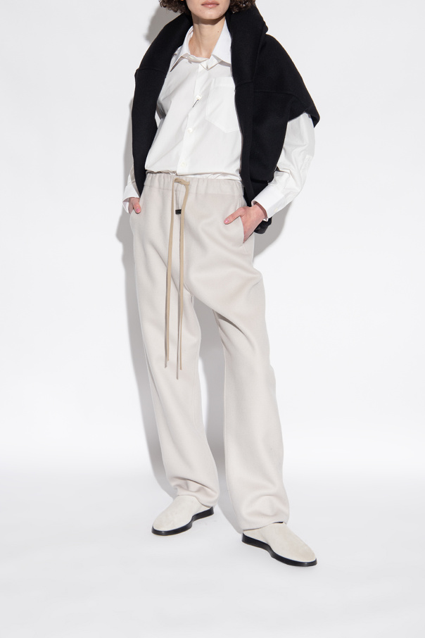 Greyish beige ‘The Eternal’ shoes from Fear Of God. Made of leather with a slip-on silhouette, this model sits on a black wooden sole with a leather trim.