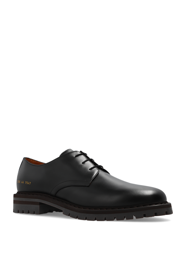 Black derby shoes from Common Projects. Made of smooth leather, this lace-up pair features a gold-tone series print and rubber sole in brown and grey.