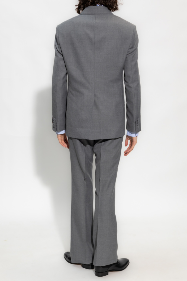 Grey suit from Gucci. Crafted partially from wool. The double-breasted blazer features buttons, notch lapels, two flap pockets, one slip pocket, two flap pockets, single rear vent and sleeves with buttoned cuffs and a logo patch inlaid with gold-tone lurex threads and Web stripe in green and red. The pleat-front trousers feature a hook, button and zip closure, two front pockets and two buttoned back pockets.