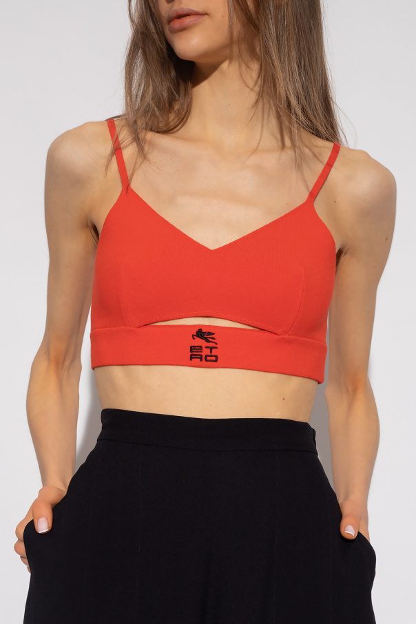 Reddish orange crop top with straps from Etro. Made of elastic fabric, this design features a decorative cut-outs and ‘ETRO CUBE’ logo embroidery in black.