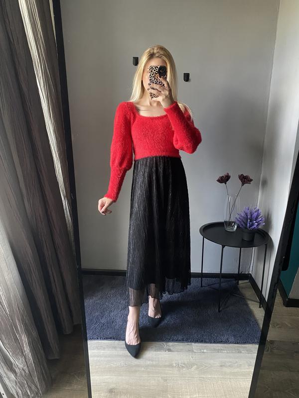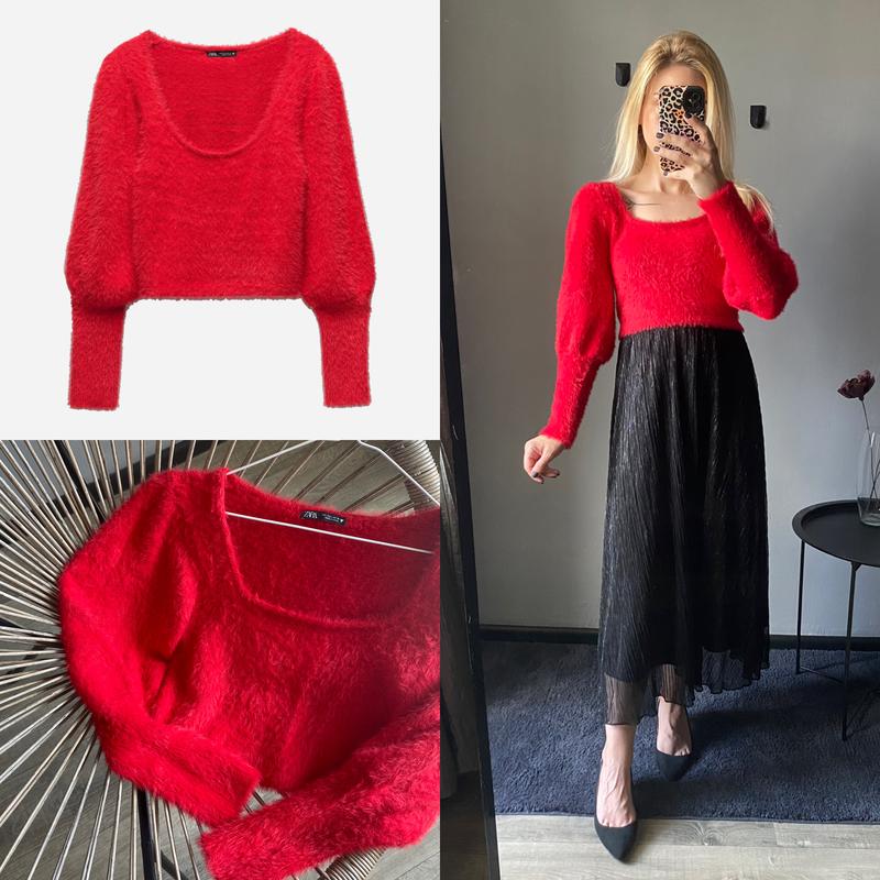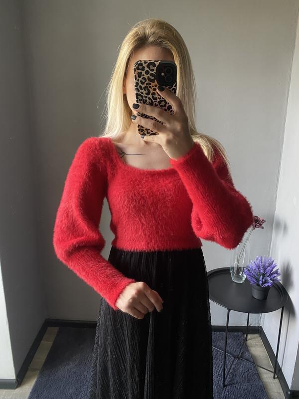 Пушистый укороченный свитер в клубничном цвете. Рукава - объемные с высокими манжетами. Мягкий и приятный к телу.