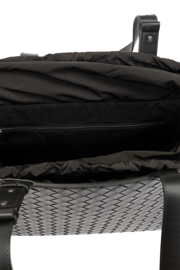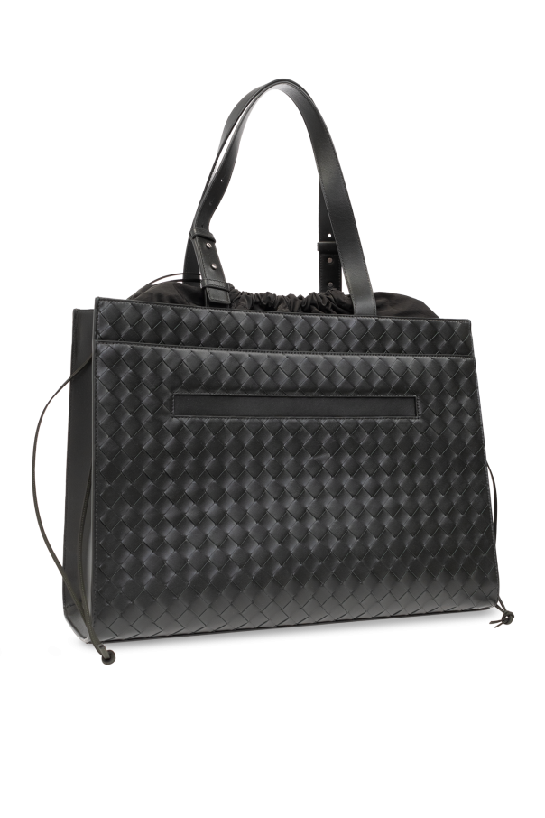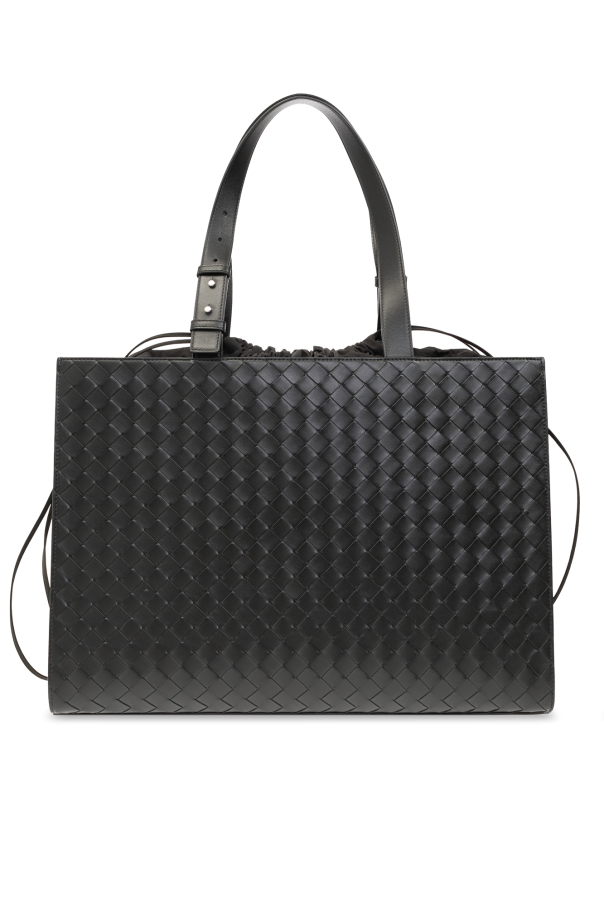 Dark green shopper bag from Bottega Veneta. Crafted from calf leather with the brand’s signature Intrecciato weave, this model features two adjustable half-round handles, back pocket, silver-tone metal hardware and one internal compartment with drawstrings, two slip pockets and one zip pocket.