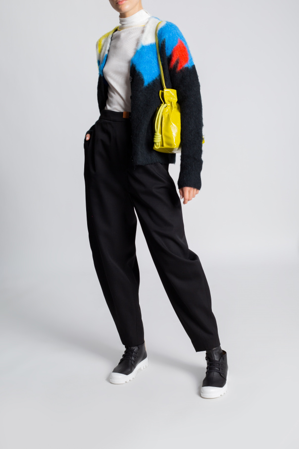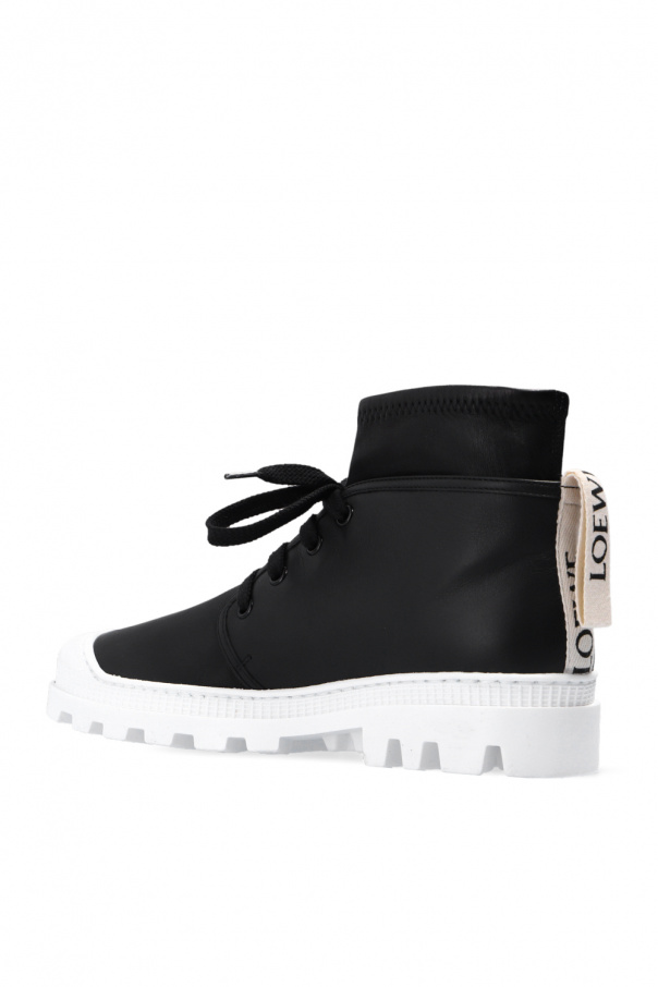 Black sock boots from Loewe. Crafted from lamb and calf leather, this lace-up pair features a logo-printed heel strap and a white rubber sole.