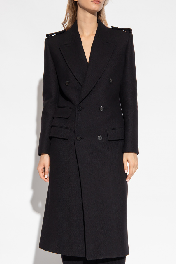 Black double-breasted coat from Saint Laurent. Crafted from wool, this design has silk lining, button fastenings, three flap pockets, two slip pockets, single rear vent and strap at the back, peak lapels, epaulette details and long sleeves with buttoned cuffs.
