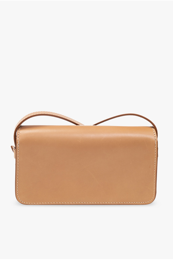 Beige sunglasses case from Saint Laurent. Made of calf leather, this item secures with a magnetic fastener and features an embossed logo on the front, an adjustable shoulder strap, gold-tone metal hardware and one internal compartment.