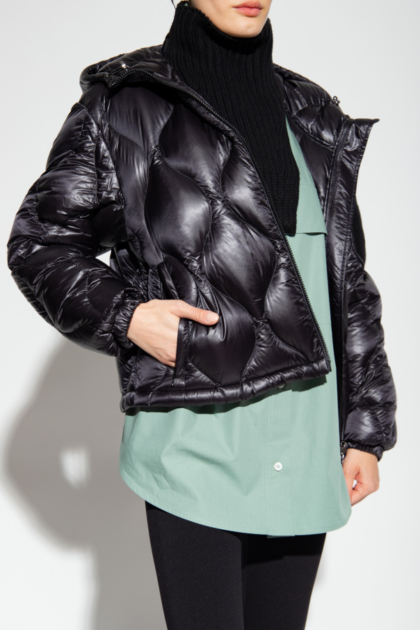 Black ‘Anthon’ down jacket with decorative quilting from Moncler. Made of recycled ripstop fabric, this design features a two-way zip, drawstring hood, sleeve pocket from a blend of wool and cashmere with a logo patch, two zip pockets, drawstring hem and long sleeves with adjustable ribbed snap-fastened cuffs.