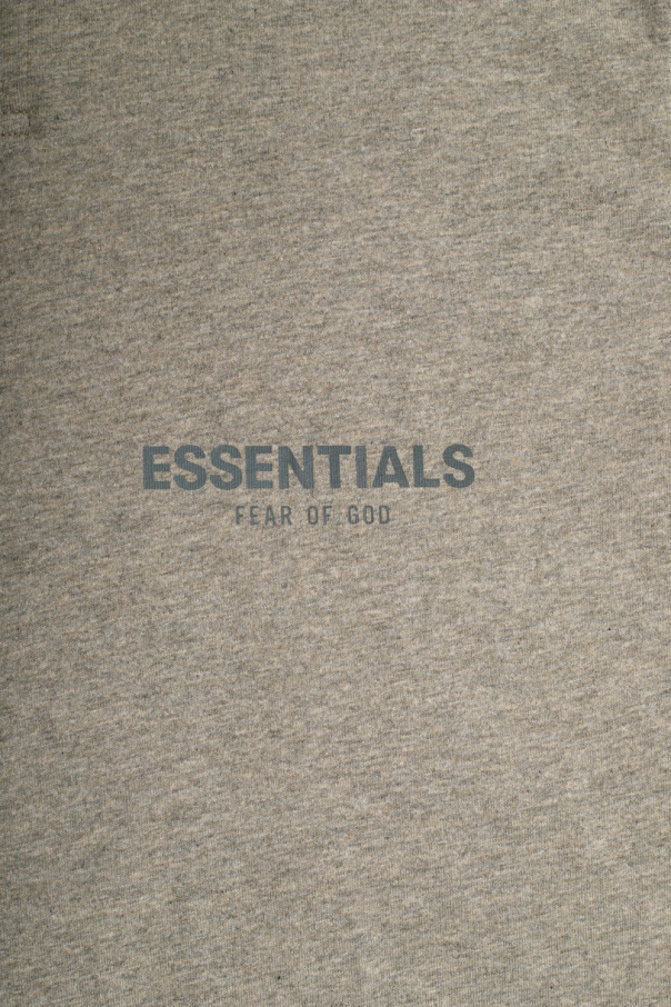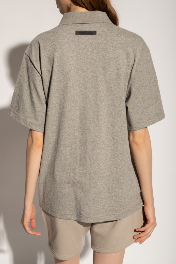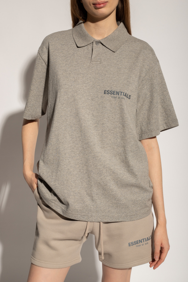 Grey polo shirt from Fear Of God Essentials. Made of cotton, this style features short sleeves, a button placket and a dark grey graphic print with the brand's logo.