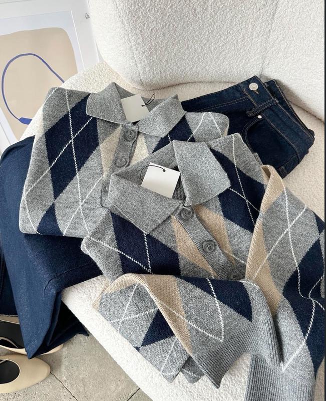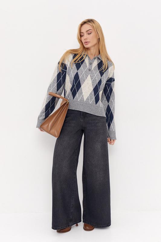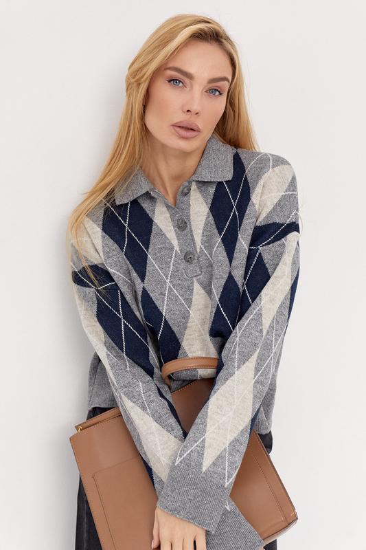 Укороченный свитер поло - это стильный и в то же время уютный выбор для прохладного времени года. Дизайн в ромбы придает изделию классический вид с нотками ретро-эстетики.Отложной воротник с разрезом, дополненным пуговицами, добавляет элегантности и позволяет регулировать глубину выреза. Прямой крой низа свитера обеспечивает комфортную посадку, а длинные рукава завершаются однотонными манжетами, придающими сдержанности и акцентирующих детали.