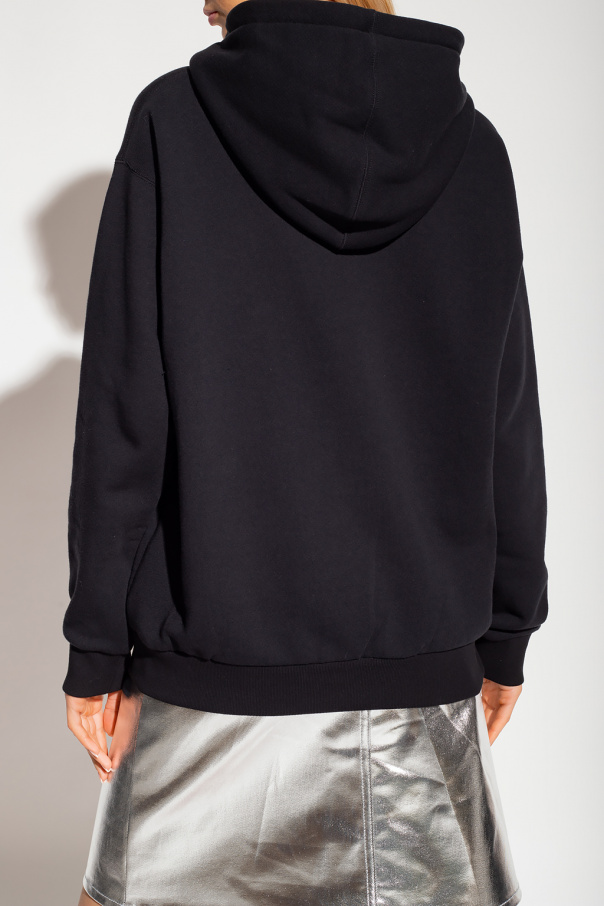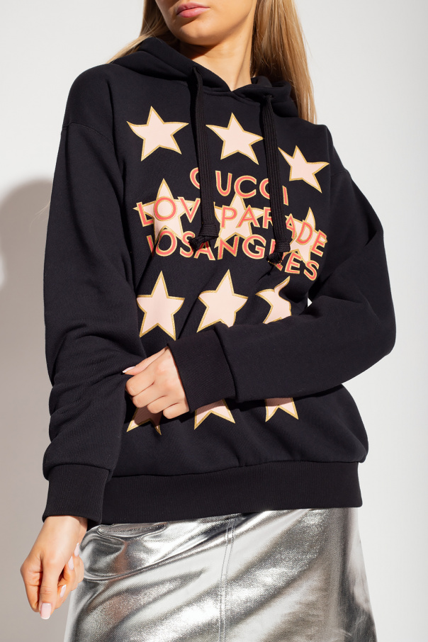 Black sweatshirt with a drawcord-adjustable hood from Gucci, the ‘Love Parade’ collection. Cut with an oversize silhouette, this style showcases a light pink, red and gold-tone Gucci Love Parade Los Angeles print accompanied by a stars motif on the front and elasticized trims on the bottom hem and cuffs.