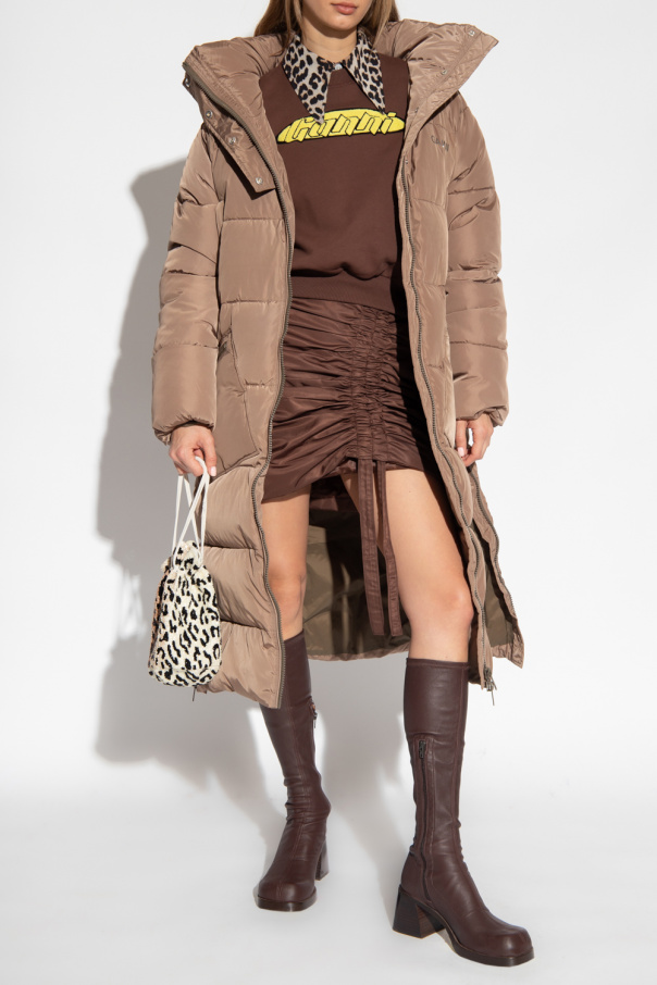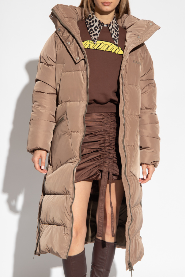 Brown insulated coat with a high collar from Ganni. Made of recycled fabric, this design features a two-way zip and snaps, logo print, two slip pockets, two zip pockets, zip details and on the sides and long sleeves with ribbed cuffs.