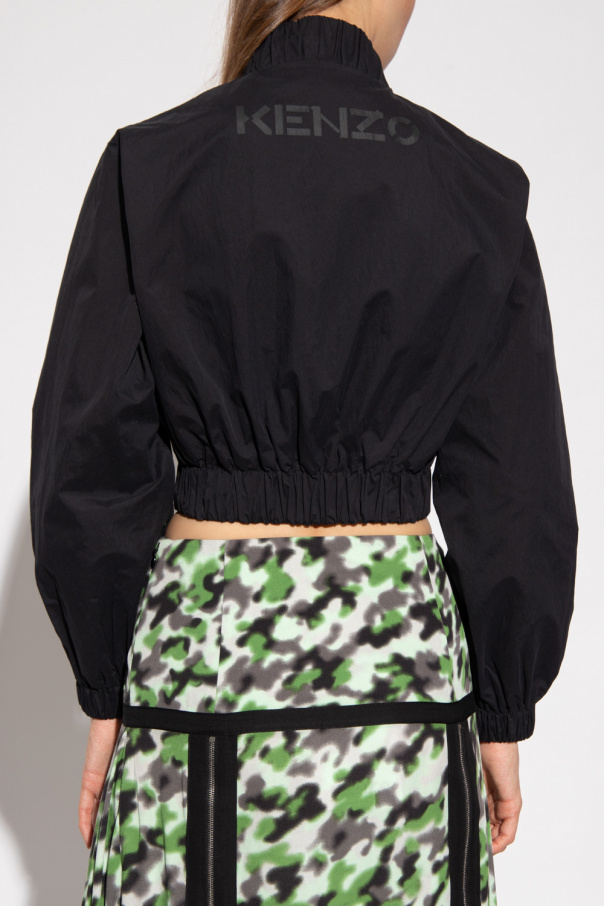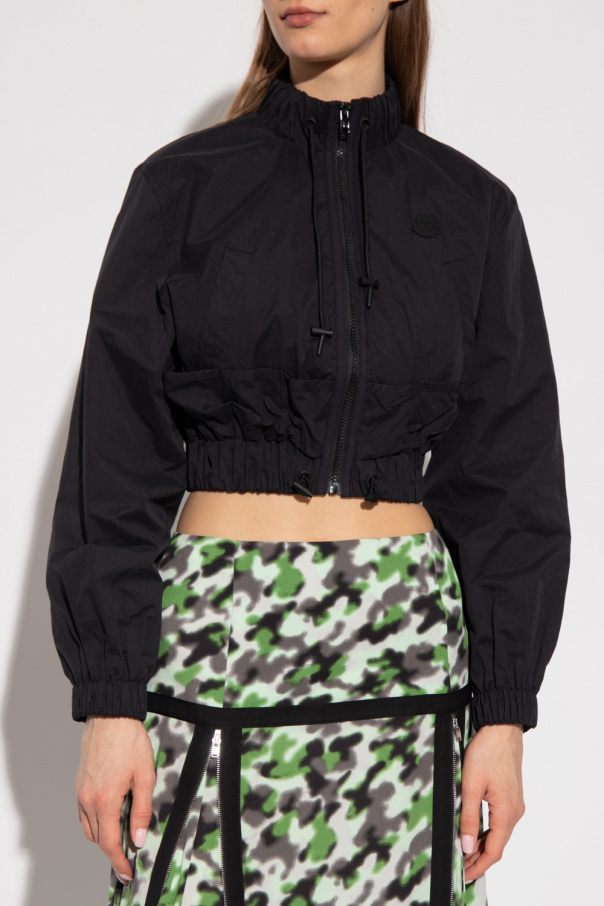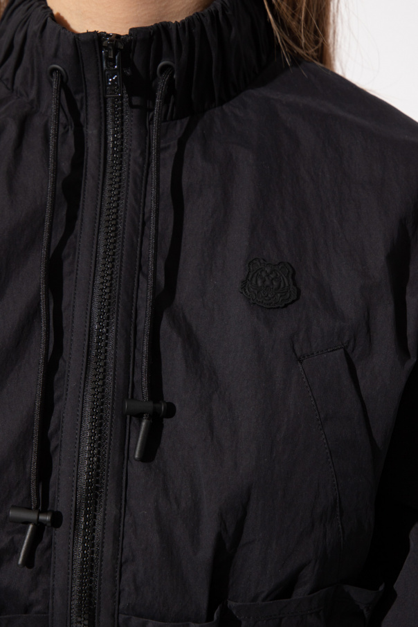 Black jacket from Kenzo. Cut with a cropped silhouette, this style features a high-neck collar, a front zip closure, a rubber patch with the brand\'s signature tiger motif and a logo print at the back, two snap-fastened pockets, six small slip pockets, elasticated cuffs and a drawcord-adjustable collar and bottom hem.