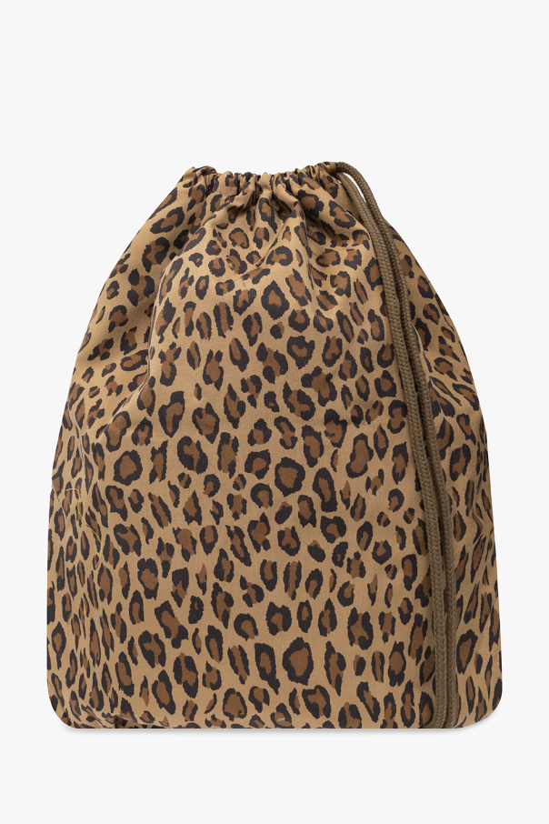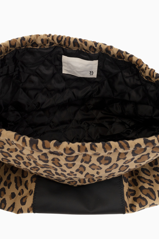 Beige, brown and black backpack from R13. This model features draw cord shoulder straps, zipped front pocket, logo print, animal pattern and quilted lining.