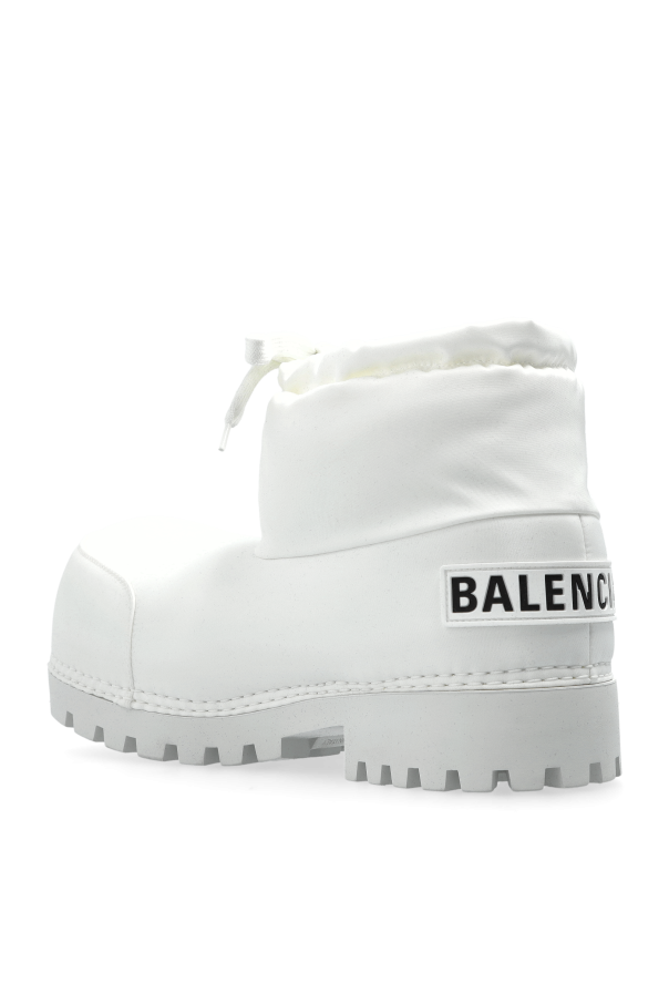 Introducing the exquisite Alaska Snow Boots from the Skiwear Collection by Balenciaga. These boots exude sophistication with their dominant white hue and minimalist elegance. Crafted with a water-resistant outer material, they are perfect for enduring the harshest of winter conditions. Their robust, streamlined silhouette features a rounded toe, accentuated by a thick, grooved sole that ensures exceptional grip on snow and ice. An iconic BALENCIAGA inscription graces the rear, signifying their prestigious lineage. The adjustable lacing at the top provides a customized fit, enhancing both comfort and style. Why Purchase This Product? Timeless design with a striking white finish. Water-resistant materials for optimal winter wear. Superior traction with a thick, grooved sole. Iconic branding and adjustable fit for added elegance. Part of the exclusive Skiwear Collection by Balenciaga.