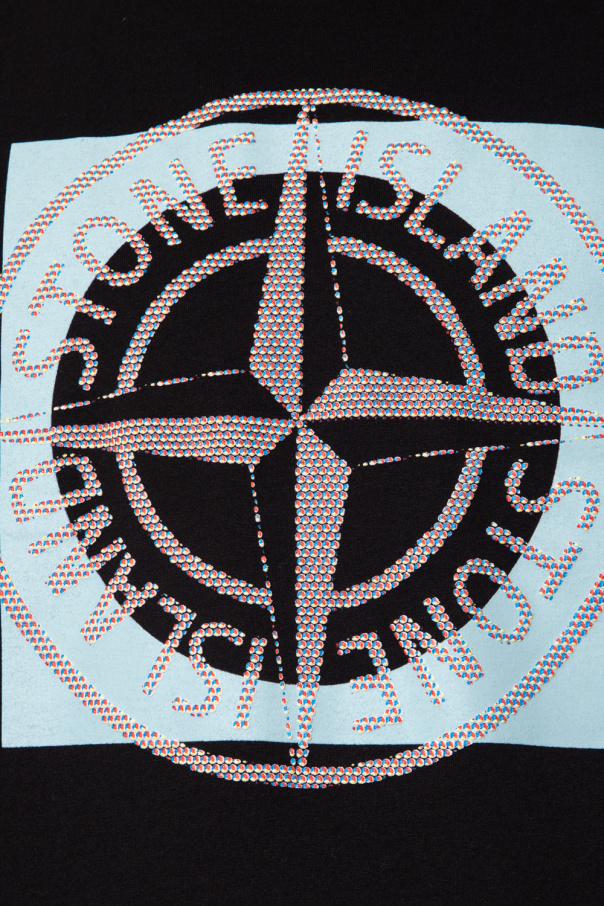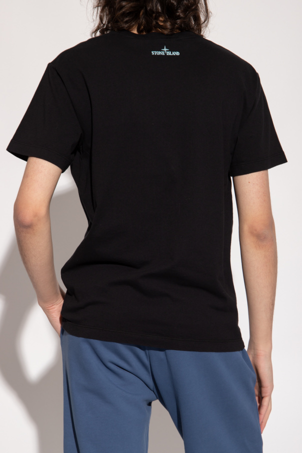 Black T-shirt from Stone Island. Crafted from cotton, this short sleeve design features a multicolored logo pattern and ribbed crew neck.