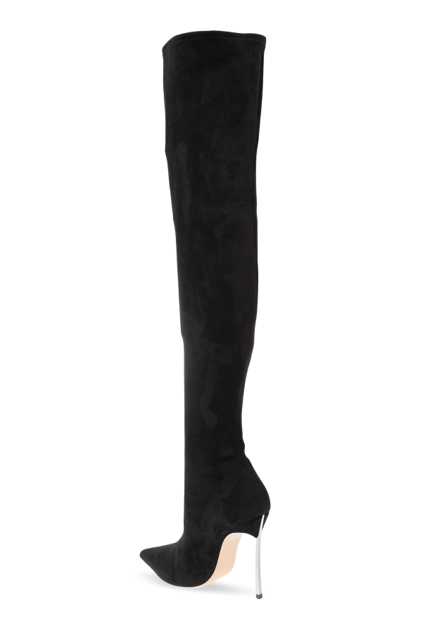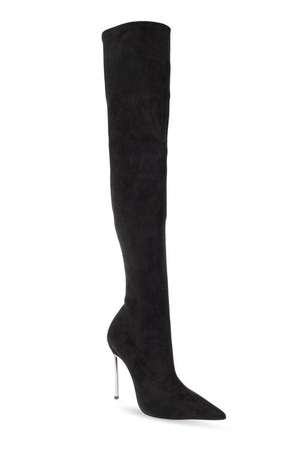 Black thigh-high boots from Casadei. Made of suede, this slip-on pair features a pointed toe and a beige leather sole.